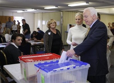 據(jù)報(bào)道,美國共和黨總統(tǒng)候選人麥凱恩4日在妻子辛迪的陪同下在亞利桑那州進(jìn)行了投票。隨后麥凱恩計(jì)劃前往鄰近的科羅拉多州和新墨西哥州出席最后的競選拉票集會(huì),當(dāng)日下午再返回鳳凰城等候選舉計(jì)票結(jié)果。