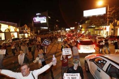 憤怒的人群擁堵在洛杉磯西好萊塢的同性戀聚集區(qū),揮舞標語高喊口號,表達不滿。一位抗議者裸露的胸前寫著:我是八號提案的受害者!