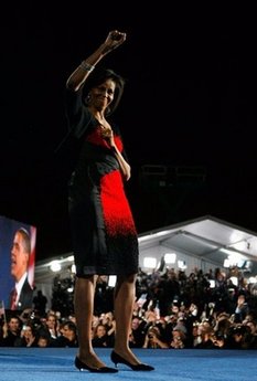米歇爾協(xié)助丈夫拉票期間,最喜歡穿著的其中一款服飾是稱身的緊身裙,在奧巴馬宣布贏得民主黨總統(tǒng)候選人提名資格的場合,米歇爾便穿了一襲由芝加哥設(shè)計師Maria Pinto設(shè)計的紫色緊身裙;出席民主國全國代表大會時,則挑選了一套出自同一設(shè)計師手筆的藍(lán)綠色V領(lǐng)連身裙。