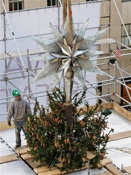 洛克菲勒中心從1933年,美國經(jīng)濟(jì)大蕭條期間,豎立第一顆圣誕樹,這項(xiàng)傳統(tǒng)延續(xù)了70多年,今年的圣誕樹是一株高21米的挪威翠松,由紐澤西的漢米頓家族所贈(zèng),上星期就已經(jīng)開始架設(shè)在中心廣場,