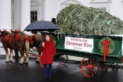 美國(guó)“第一夫人”勞拉30日在白宮門前冒雨迎接圣誕樹,這已經(jīng)是她第8次亦是最后一次以白宮主人身份主持簡(jiǎn)單的接受儀式。她的丈夫喬治-布什即將卸任總統(tǒng),之后兩人便會(huì)告別白宮。