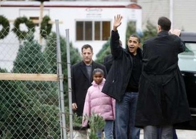 奧巴馬當(dāng)天帶兩個女兒和女兒的一個朋友,到芝加哥南區(qū)一個圣誕樹市集上,物色今年家里要用的圣誕樹。
