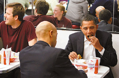 經(jīng)過一輪哄動,奧巴馬亦無忘記此行目的,向職員詢問:“食物在哪?”引起全場大笑。最后他與芬蒂點了辣味熱狗及炸芝士條。奧巴馬在進食期間與其他客人交談,又向侍應(yīng)索取芝士條調(diào)味。