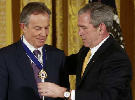 據(jù)英國《每日郵報》報道,美國總統(tǒng)布什13日向英國前首相布萊爾頒發(fā)了總統(tǒng)自由勛章。這一勛章是美國授予平民的最高榮譽(yù)。