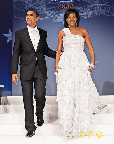 至于奧巴馬本人,則是以黑色禮服、配以白色領(lǐng)結(jié)與襯衫出席舞會(huì),禮服翻領(lǐng)上扣有美國(guó)國(guó)旗的襟章。