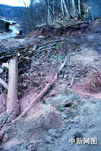 冷風(fēng)吹動紅白相間的警戒帶,推土機挖掘出的一條大約3米寬的斜坡路旁邊橫七豎八地倒臥著被伐倒的樹木,路邊和路中間“探寶”留下的的鉆孔清晰可見。斜坡上一塊大約10多平方米的平地上連著至少鉆了4個洞孔,每個間隔只有60厘米,四周散落著淡紅色的巖石粉末。