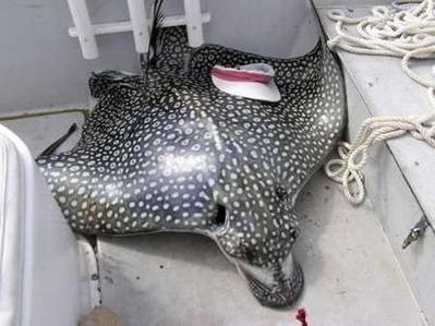 斑點(diǎn)黃貂魚能夠長到200多公斤,翼展能夠長到3米左右,它們偶爾會(huì)躍出水面但是攻擊性并不強(qiáng),也會(huì)用它們尾部堅(jiān)硬的毒鉤進(jìn)行防御。