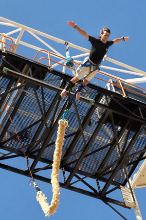 南非擁有世界上最高的蹦極點(diǎn),熱衷蹦極的人們常常在南非找刺激。近日,一位另類的蹦極手創(chuàng)下了蹦極運(yùn)動(dòng)的新紀(jì)錄:37歲的葡萄牙男子卡爾·迪奧尼西奧用1.85萬個(gè)安全套做成30米長的彈性繩,代替?zhèn)鹘y(tǒng)尼龍繩跳下蹦極臺(tái),將“生死一線牽”的感覺發(fā)揮到極致。