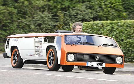 這輛露營(yíng)車被命名為“敞篷蛋糕(Van-Cake)”,時(shí)速最高可達(dá)128公里/小時(shí)。桑德斯的團(tuán)隊(duì)將原有大眾車1.38米高的頂棚切割掉,改裝成了一個(gè)35厘米高的頂棚。他們?cè)谲噧?nèi)放入新的操縱系統(tǒng)和低矮的座位。受制于空間,這輛車不是使用腳剎,取而代之的是手動(dòng)剎車和變速桿;燃料槽也是經(jīng)過(guò)特別制作的。目前已經(jīng)取得合法上路的資格。由于這輛車非常矮,它可以輕松地從停車場(chǎng)柵欄下通過(guò)。