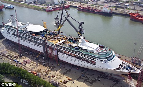 中新網(wǎng)8月26日電 綜合報(bào)道,把游輪“一刀兩斷”,然后再塞進(jìn)去一節(jié)船艙,繼而拼裝成一艘“擴(kuò)大版”的客輪,這樣的“大刀闊斧”可不是幻覺,這艘長916英尺游輪的主人確實(shí)將船鋸開,要將其再擴(kuò)展73英尺。
