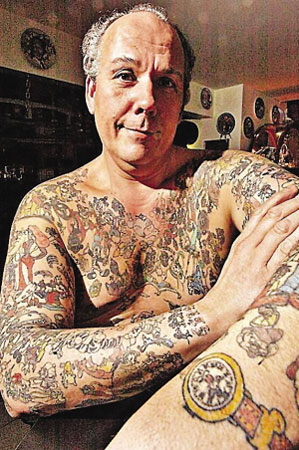 美國賓夕法尼亞州伯利恒市53歲男子喬治·賴格從8歲首次踏入迪斯尼樂園起,就與迪斯尼結(jié)下了不解之緣:他的家被裝飾成“迪斯尼風(fēng)格”,屋中擺滿了26000多件迪斯尼紀念品。為了表示對迪斯尼動畫片的熱愛,賴格從18歲起就開始在身上文上各種迪斯尼動畫主角圖案,他在肚皮上文上了《木偶奇遇記》、在左肩文上了《美女與野獸》、在背部文上了《101斑點狗》……除了臉部、頸部和雙手外,賴格迄今為止在全身總共文滿了1900多個迪斯尼動畫主角圖案!