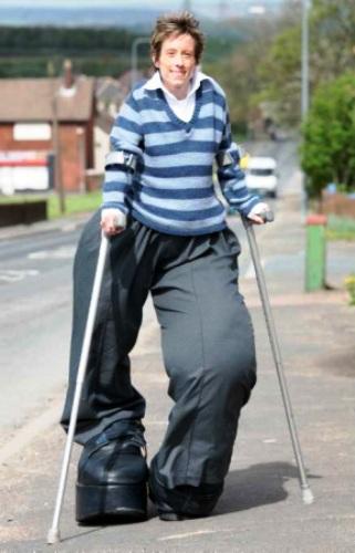讓她的家人驚訝的是,她在整個(gè)童年時(shí)期,兩條腿的生長(zhǎng)速度都一直比其它身體部位快!最后她再也不能獨(dú)立行走了,F(xiàn)在她要借助拐杖,或者借助一輛經(jīng)過(guò)特殊改裝的汽車(chē)才能出行。塞拉斯的家在英格蘭西北部,她一直找她們家附近的一位鞋匠定做鞋子,因?yàn)樗膬芍荒_也畸形發(fā)育,右腳長(zhǎng)16英寸(40.64 厘米),寬7英寸(17.78 厘米),但是她的左腳長(zhǎng)僅有11英寸(27.94 厘米),而且整個(gè)腳是反長(zhǎng)的。不僅如此,塞拉斯的兩條腿長(zhǎng)度也不一樣。因此每定做一雙鞋,她都要仔細(xì)試穿,反復(fù)試穿直到最后確定鞋樣,整個(gè)過(guò)程需要花費(fèi)幾周時(shí)間。定做這樣一雙鞋的費(fèi)用大約是4000美元,塞拉斯必須籌集這些錢(qián),因?yàn)樗龥](méi)有工作。