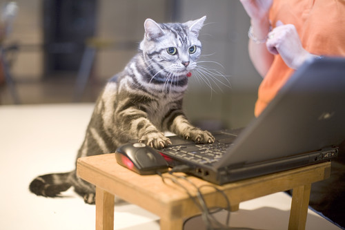 一只美國短毛貓?jiān)谛阌?jì)算機(jī)技能。