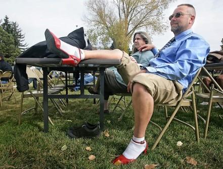 中新網(wǎng)10月20日電 綜合報(bào)道,10月18日,在美國(guó)懷俄明州舉行的“穿上她的高跟鞋行走一英里”的活動(dòng)中,男人們穿上高跟鞋,呼吁人們關(guān)注家庭暴力。