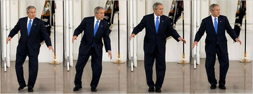 2008年3月5日,在獲得黨內(nèi)提名所需的1191張黨代表票后,美國(guó)共和黨總統(tǒng)候選人約翰·麥凱恩前往白宮,與總統(tǒng)布什共進(jìn)午餐,作為布什正式宣布支持他的前奏。但布什卻被麥凱恩晾在白宮北門(mén)等了好一會(huì)兒。早早來(lái)到白宮北門(mén)的布什左等右等麥凱恩不到,為了調(diào)節(jié)氣氛,竟然在眾位記者面前獨(dú)自跳起踢跶舞來(lái)。