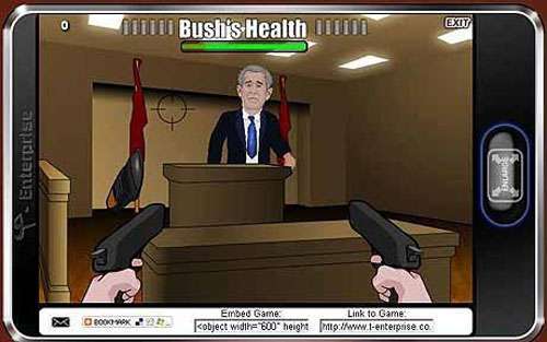 據(jù)了解,《布什靴營》的玩家可扮演一名保安特工,玩家必須在突然擲出的鞋擊中總統(tǒng)之前開槍把鞋擊落。玩家們只要滑動鼠標(biāo),瞄準(zhǔn)槍上的十字絲,然后開火就行了。每次布什總統(tǒng)誤中槍火或被鞋子擊中,他的“生命”便會減少。當(dāng)生命減至零時玩家便輸了。