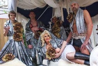 扮裝皇后Miss Wendy 扮成圣母瑪利亞,懷里抱著玩偶,周圍是一些同性戀男子。