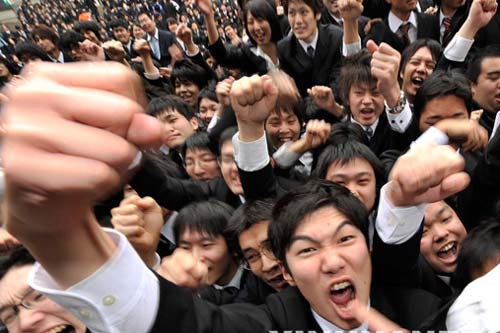 2月5日,在日本東京舉行的一個求職者集會上,大學生們振臂高呼,互相鼓勵并為自己加油。