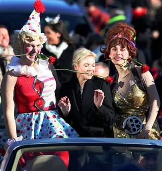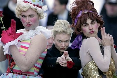 中新網(wǎng)2月6日電 據(jù)美聯(lián)社報道,5日哈佛大學(xué)的速食布丁劇團將速食布丁年度女性大獎授予女星蕾妮•齊薇格。蕾妮•齊薇格按照以往慣例,帶領(lǐng)一群男扮女裝的學(xué)生們在哈佛校園中進行一場盛大游行。