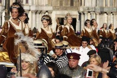 2月15日,參加威尼斯狂歡節(jié)的游行隊伍行進(jìn)在圣馬可廣場上。