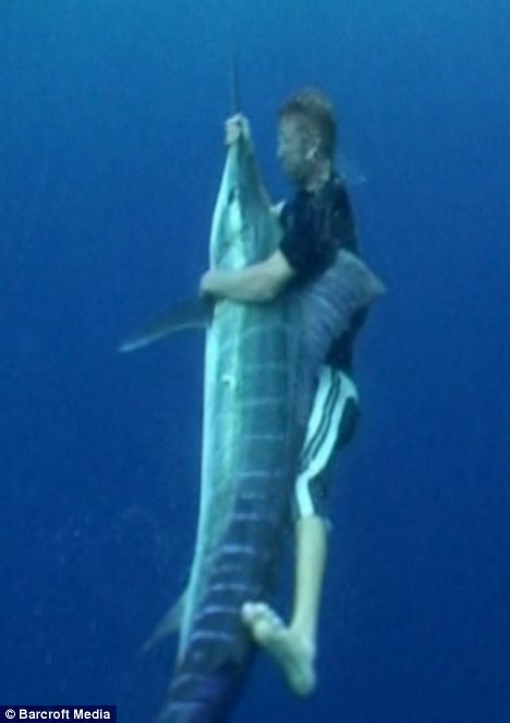 這名男子今年33歲。據(jù)他稱,一生中盡和大魚打交道了,在捕魚表演方面經(jīng)驗豐富。有一次在沖浪板上捕魚的時候,槍魚把他拽出11公里。最驚險的一次就是從直升飛機(jī)上跳下,徒手捕到一只槍魚。