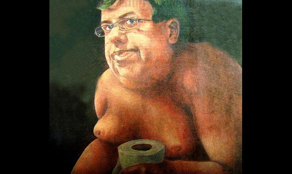 在愛(ài)爾蘭皇家海柏尼恩學(xué)院展出的畫(huà)中,考恩挺著圓鼓鼓的大肚子,左手拎著一條藍(lán)色內(nèi)褲。在愛(ài)爾蘭國(guó)家藝?yán)日钩龅漠?huà)中,考恩裸露上身,左手攥著一卷衛(wèi)生紙,看起來(lái)正在蹲馬桶。兩幅畫(huà)展出不到20分鐘,立即引發(fā)轟動(dòng),有關(guān)部門(mén)勒令畫(huà)廊立即將畫(huà)作拿下。