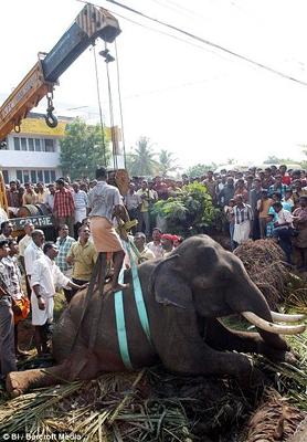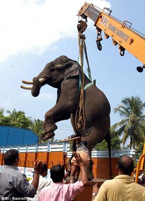 據(jù)英國(guó)《每日郵報(bào)》4月1日的報(bào)道,周二,印度喀拉拉邦一頭公象在交通繁忙的公路上被一輛卡車撞到,兩條后腿骨折和背部受傷,獸醫(yī)不得不動(dòng)用起重機(jī)來(lái)搬運(yùn)這個(gè)“龐然大物”。據(jù)報(bào)道,這頭大象高9英尺(約2.7米),重達(dá)6噸,剛剛從附近的一家印度教寺廟逃出。在事發(fā)現(xiàn)場(chǎng),數(shù)百名觀眾正在觀看獸醫(yī)如何救治受傷的大象和如何將它搬離現(xiàn)場(chǎng)。一名獸醫(yī)表示,這頭大象體型龐大,情緒極不穩(wěn)定。不過(guò),它此前一直生活在附近人來(lái)人往的寺廟,所以對(duì)人并不十分恐懼。在對(duì)大象做過(guò)全面評(píng)估后,他們決定從附近的建筑工地上征用一輛起重機(jī),將這頭大象吊到卡車上,將它運(yùn)往一家獸醫(yī)醫(yī)院。據(jù)悉,搬運(yùn)工作進(jìn)展得十分順利。不過(guò),令人可悲的是,盡管獸醫(yī)在努力救治這頭大象,但由于它的傷勢(shì)過(guò)于嚴(yán)重,于當(dāng)天晚間死去。