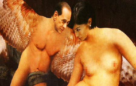 在潘塞卡的這幅作品中,貝盧斯科尼化身赤裸著身體的天使,用巨大的翅膀親昵地?fù)е獯罄麢C(jī)會平等事務(wù)部長瑪拉·卡爾法尼亞,含情脈脈地盯著自己的女部下。