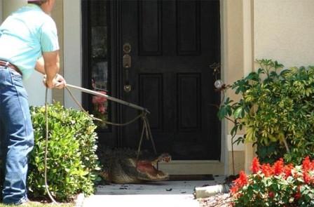 中新網(wǎng)4月29日電 據(jù)英國媒體報道,日前在佛羅里達(dá)州郊區(qū)的一家住戶門外驚現(xiàn)一條長達(dá)11英尺的鱷魚,這家主人被困屋內(nèi)緊急報警,野生動物專家用了一個小時才把這位“不速之客”請走。