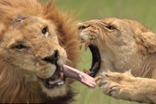 正在博茨瓦納奧卡萬(wàn)戈三角洲觀察獅群的野生動(dòng)物攝影師李維坦拍下了這組驚人的畫面。據(jù)他描述,當(dāng)時(shí)鄰近一只處在發(fā)情期的母獅朝公獅發(fā)出曖昧的呼喚,公獅的雌性伴侶立即醋意大發(fā),并試圖阻止公獅接近那只發(fā)情的母獅。然而,公獅全然不顧伴侶的警告,尋著母獅的叫聲蹦去,結(jié)果就發(fā)生了照片中驚人的一幕。