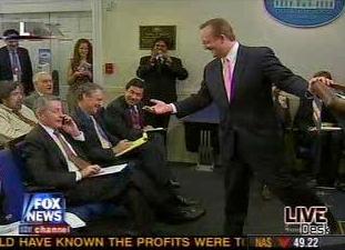 三家主要的有線電視臺都實況轉(zhuǎn)播了白宮新聞發(fā)布會。《人事》雜志記者約翰-吉茲的手機首先傳出鈴聲。吉布斯在聽到鈴聲后稱:“請放至震動,我們以前也是這樣作的。”當手機再次發(fā)出聲音后,吉布斯走下講臺,要求吉茲交出手機,他隨后把手機扔給站在房間后面的一位助手。就在吉布斯回到講臺,開始回答一個問題時,美國哥倫比亞廣播公司記者比爾-普朗特的手機又響了起來。已負責報道白宮事務(wù)25年的普朗特拒絕了吉布斯交出手機的要求,他離開了房間,人們發(fā)出一陣笑聲,普朗特五分鐘后回到他的前排座位。