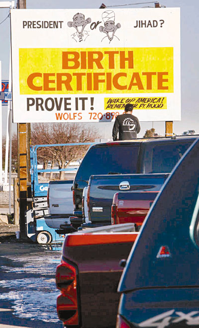 據(jù)香港《文匯報(bào)》22日報(bào)道,這幅廣告牌豎立于距離丹佛以西11公里的第70號州際公路旁,剛于前日由藝術(shù)家里爾完成。奧巴馬卡通肖像下有一個(gè)黃色大方格,上書“出生證書,請證明!“顯然在質(zhì)疑,奧巴馬是否真的在夏威夷出生及擁有美國公民身份。
