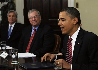 奧巴馬曾經指責這些領取高額花紅的“肥貓銀行家”,因此他借這次會面促使這些銀行擴大向小企業(yè)的貸款,以及停止干擾立法整頓金融管理系統(tǒng)的工作。
