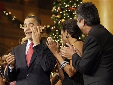 奧巴馬在白宮的第一個圣誕晚會,邀請了多名歌手到場表演,不過,可能是因為現(xiàn)場氣氛太溫馨感人,奧巴馬竟在合唱圣歌時偷偷擦掉流下來的眼淚。