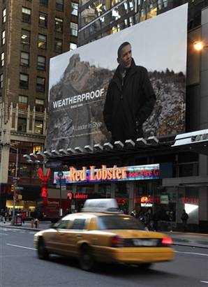 中新網(wǎng)1月7日電 6日,一幅奧巴馬的巨幅照片出現(xiàn)在美國紐約時(shí)代廣場(chǎng),這一次奧巴馬的形象不再完全代表國家總統(tǒng),他成了一個(gè)外衣品牌的代言人。