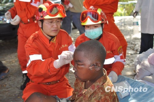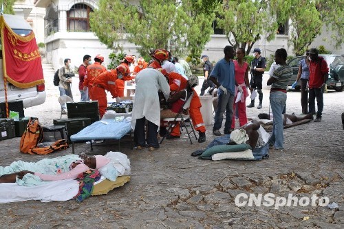海地當(dāng)?shù)貢r(shí)間14日9時(shí),中國(guó)武警總醫(yī)院赴海地國(guó)際救援醫(yī)療分隊(duì)開(kāi)設(shè)第一個(gè)流動(dòng)醫(yī)療點(diǎn),已為110名受傷的災(zāi)民提供醫(yī)療救助。海地總理禮賓官趕到醫(yī)療救助點(diǎn),他握著來(lái)自中國(guó)武警總醫(yī)院的醫(yī)生的手說(shuō):“感謝中國(guó)國(guó)際救援隊(duì),你們是第一支來(lái)總理府進(jìn)行人道主義救助的救援隊(duì)”。
