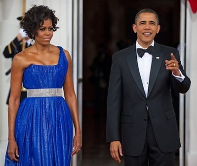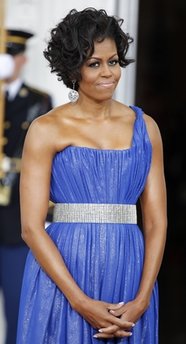 當(dāng)晚,奧巴馬夫人米歇爾再次閃亮登場,其著裝打扮又被眾媒體拿來評點一番。米歇爾穿了亮藍色單肩拖地長裙,腰間系上銀色腰帶,并佩戴了銀色耳環(huán)。