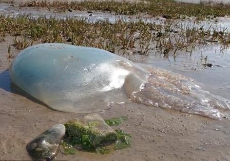 這種水母的學(xué)名稱為Rhizostoma octopus,因為它有8條大觸須,通常生活在英國海岸附近,被海流和海風(fēng)吹上岸邊。