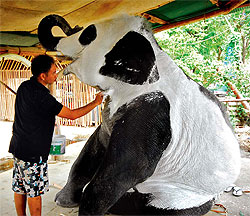 這張照片配上標(biāo)題“泰國(guó)大象只能露齒微笑并忍受”,特別引人深思。報(bào)道說(shuō),水彩對(duì)大象無(wú)害,大象似乎也不介意。工人慢慢地在大象身上仿造全國(guó)對(duì)熊貓的狂熱。