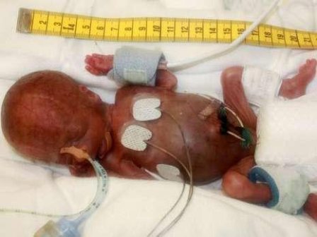 這名男嬰于2009年6月出生,比預(yù)產(chǎn)期提前了15周。當時他在母親體內(nèi)有危險,醫(yī)生立即實施了剖腹產(chǎn)。出生時男嬰極其纖弱,大小和一張A4紙差不多,體重只有275克,輕得像一塊黃油。醫(yī)生不得不把他放在保育箱里,但是仍然不能保證其成活。經(jīng)過6個月的精心護理,2009年12月,這名男嬰體重增加到3.7公斤,和一名足月的新生兒差不多大小,順利出院。