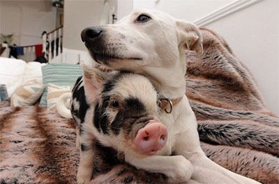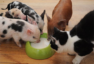 克羅夫特家的寵物“長(zhǎng)老”是狗狗黛西和貓咪?送,這一狗一貓都不是吝嗇的小動(dòng)物,它們?cè)敢夂兔阅阖i們分享自己的一切,包括床和食物。因此常常可見小豬們和貓咪躺在一起睡覺、一起喝牛奶;或是看到小豬黏在狗兒黛西身上,相互依偎。有時(shí)候好幾只豬集體霸占黛西的睡床,它寧愿看著小豬熟睡,自己卻坐得直挺挺地,不敢吵醒它們。