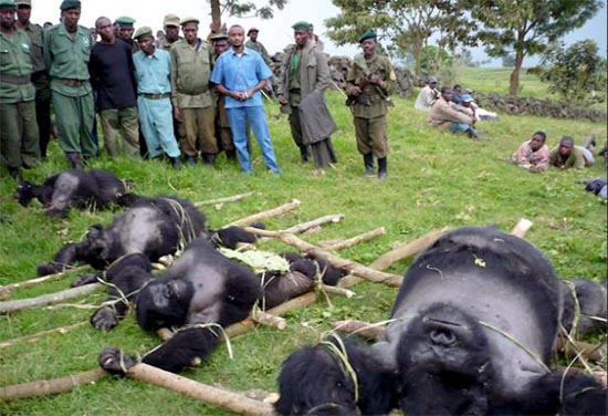 僅2007年6、7兩月就有7頭大猩猩被屠殺,而一頭名為Senkwekwe、重達(dá)500磅的銀背大猩猩的遇害照片更令村民們悲痛不已。除200只珍稀猩猩被殺害,森林砍伐加速,自然資源流失,更令人發(fā)指的是,過去10年共有150多名護(hù)林隊(duì)員在剛果民主共和國東部地區(qū)的五個(gè)公園中被謀殺。