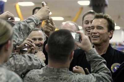 16日,美國(guó)加州州長(zhǎng)施瓦辛格來(lái)到位于伊拉克首都巴格達(dá)郊區(qū)勝利營(yíng)一個(gè)熱鬧的餐廳,與在餐廳的駐伊美軍士兵們見(jiàn)面。他對(duì)軍隊(duì)的工作表示祝賀,感謝士兵及其家人做出的犧牲,并與士兵握手、擺姿勢(shì)拍照。施瓦辛格還叮囑士兵們健身鍛煉的必要性,表示“每天都要(為自己)打氣”。