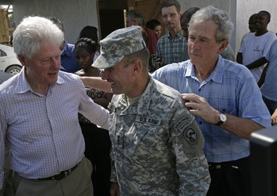 這兩位前總統(tǒng)是于本周一到海地進(jìn)行人道訪問(wèn),視察當(dāng)?shù)?月12日大地震后的災(zāi)情。兩人特地到首都太子港探訪災(zāi)民,當(dāng)經(jīng)過(guò)頹垣敗瓦的廢墟時(shí),不約而同和居于臨時(shí)帳篷的災(zāi)民握手。