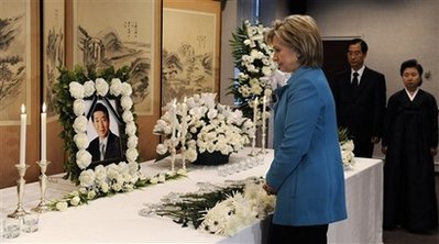 希拉里當(dāng)天上午9時(shí)抵達(dá)大使館,在韓國(guó)駐美大使韓德洙的帶領(lǐng)下走向盧武鉉的靈堂。在吊唁簿上簽字,向靈堂獻(xiàn)花,并進(jìn)行了默哀。