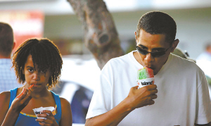 果然,美國總統(tǒng)這次又選擇了這種混合檸檬、櫻桃以及熱帶水果糖漿的刨冰,沒有再加紅豆和奶油等點(diǎn)綴!拔蚁矚g直接吃這種冰,不需要其他裝飾,”奧巴馬指著菜單上的“雪巴馬”字樣笑著告訴記者。