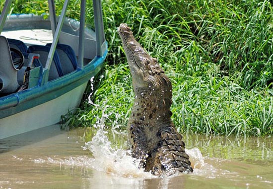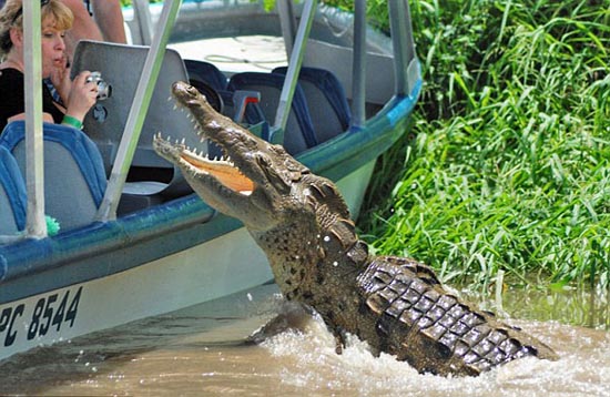 根據(jù)保羅的描述,當(dāng)看到河上那只懶洋洋的鱷魚后,船上的導(dǎo)游就用木棍敲打水面,希望能吸引鱷魚更靠近一些。“鱷魚果然隨著木棍游來,越來越近,當(dāng)大家都還沒轉(zhuǎn)過神時(shí),那只原本溫順的鱷魚突然躍出水面,張著血盆大口朝那位女游客撲過去!边@時(shí)船上的所有游客都尖叫起來,大家都拼命向后退。