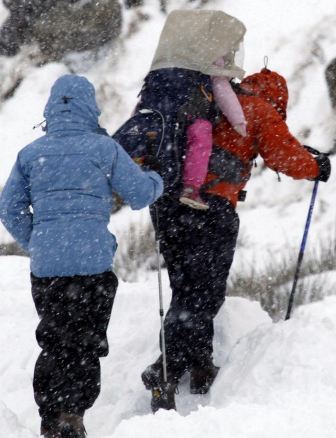 夫妻倆將車停在斯諾登尼亞國家公園的登山口,帶著女兒,沿著一條小徑開始朝山上艱難地邁進。他們計劃攀到高1085米的斯諾登峰山頂。女兒被爸爸背在背上并固定住,臉部用一個塑料框罩住以防寒。