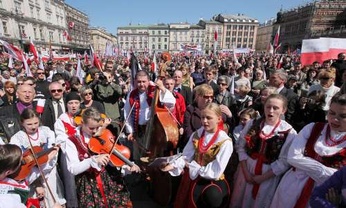 當(dāng)靈車緩慢穿過克拉科夫狹窄街道時,哀悼者為卡欽斯基夫婦鼓掌、拋花和揮舞波蘭國旗。卡欽斯基夫婦的遺體,是用飛機(jī)從華沙運抵這里的。