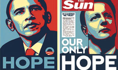 中新網(wǎng)5月7日電 據(jù)香港《文匯報(bào)》報(bào)道,英國《太陽報(bào)》6日仿照奧巴馬2008年競選海報(bào)設(shè)計(jì),推出支持保守黨黨魁卡梅倫的版面。